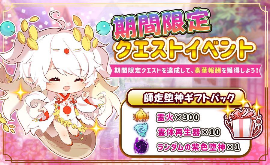当日のデイリークエストを全てクリアする事で、報酬としてゲーム内アイテムと「火種」を1つ獲得でき、「火種」を4つ集める事で、【師走堕神ギフト】と交換する事が出来ます。また、イベント4日目に、幻晶石で「火種」を購入出来る機能も追加されますので、イベントに参加して、豪華ギフトを手に入れましょう!